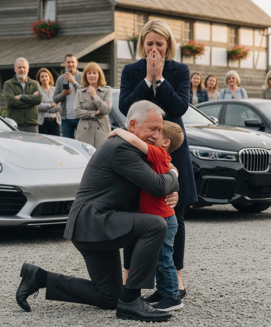 An einem schwülen Nachmittag, während Lukas draußen Fußball spielte, hielten drei schwarze Autos vor unserem kleinen Haus mit der abblätternden Farbe. Ein älterer Herr in einem maßgeschneiderten Anzug stieg aus dem ersten Wagen, auf einen silbernen Gehstock gestützt. Seine Leibwächter umringten ihn wie Schatten. Ich erstarrte auf der Veranda, meine Hände noch nass vom Geschirrspülen. Die Augen des alten Mannes trafen meine, erfüllt von einer seltsamen Mischung aus Schmerz und Erstaunen. Dann – bevor ich reagieren konnte – fiel er auf dem Kiesweg auf die Knie.