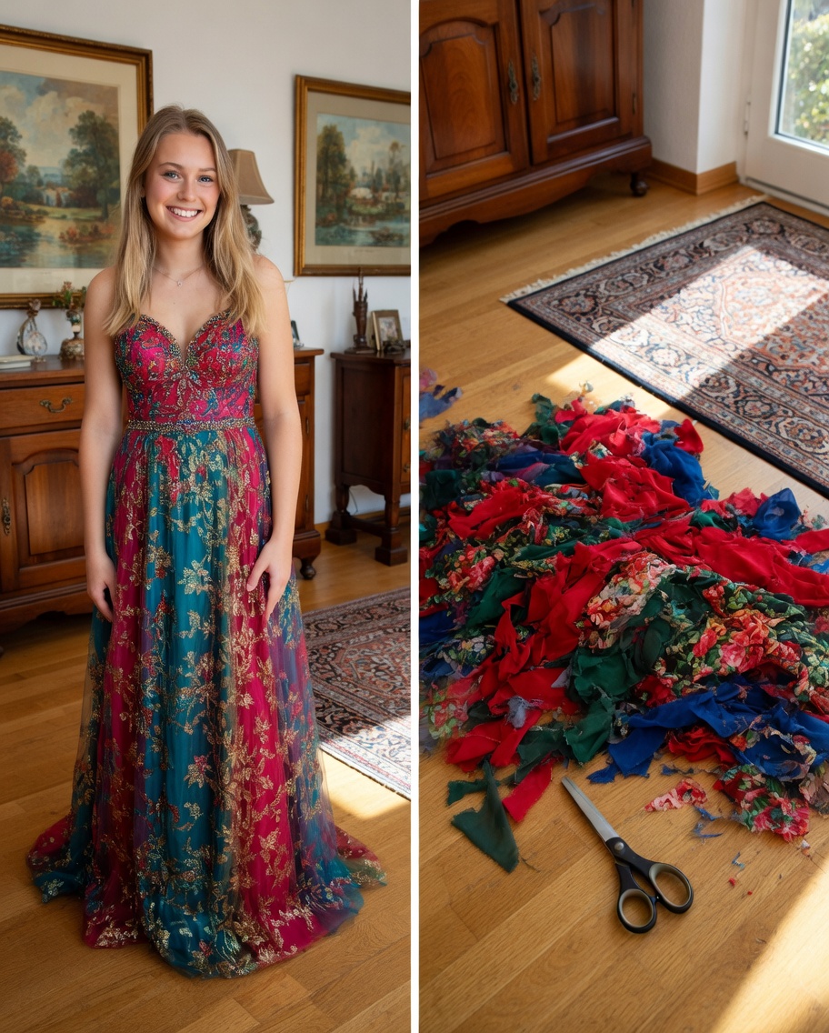 Es war nicht perfekt. Der Saum hing auf einer Seite etwas zu tief, und der Ausschnitt machte mir Schwierigkeiten. Aber es war wunderschön. Es schimmerte im Licht, ein Wirbel aus Farben und Liebe. Ich hängte es an meine Schranktür und flüsterte: „Mama, ich habe das für dich gemacht.“