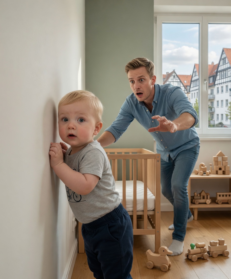 Dann, eines Nachts um 02:14 Uhr, explodierte das Babyfon mit einem Schrei, der so schrill war, dass Tobias kerzengerade im Bett aufschreckte. Er rannte den Flur entlang. Lukas stand wieder in der Ecke, zitterte leicht, seine winzigen Hände gegen die Wand gepresst. Er schrie nicht mehr – er atmete nur schnell, als wäre er aus einem Albtraum erwacht. Tobias hob ihn sofort hoch. „Alles ist gut. Du bist sicher“, flüsterte er. Doch Lukas wand sich in seinen Armen und versuchte, zurück zur Wand zu blicken.