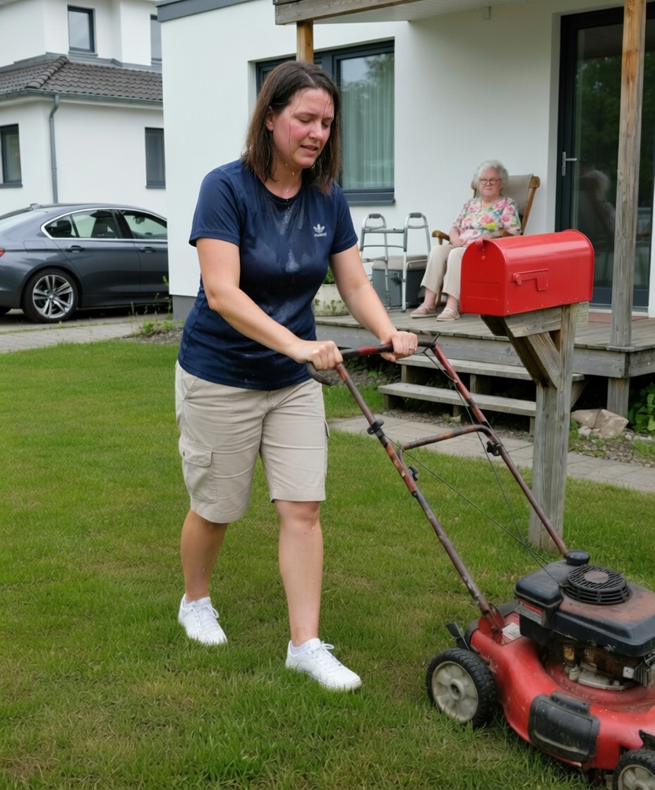 Ich zögerte. Die Sonne brannte, mein Rücken schmerzte, und das Letzte, was ich sein wollte, war die Heldin für irgendjemanden. Hundert Gedanken schossen mir durch den Kopf – meine geschwollenen Knöchel, die unbezahlten Rechnungen in meiner Hand, jedes Scheitern. Für einen Sekundenbruchteil wollte ich fast wieder reingehen. Aber Frau Wagner blinzelte hastig und rang nach Luft. „Soll ich Ihnen ein Glas Wasser holen?“, rief ich und kam bereits näher. Sie winkte ab, Stolz lag in jeder ihrer Falten. „Ach nein, mir geht’s gut. Ich muss das nur fertigkriegen, bevor die Nachbarschaftsaufsicht ihre Runde macht. Du weißt ja, wie die sind.“ Ich lachte kurz auf. „Erzählen Sie mir nichts.“ Sie lächelte, ließ den Mäher aber nicht los. „Im Ernst, lassen Sie mich helfen“, sagte ich und trat näher. „Sie sollten bei dieser Hitze nicht hier draußen sein.“ Sie runzelte die Stirn. „Das ist zu viel für dich, Liebes. Du solltest dich ausruhen und nicht den Rasen für alte Damen mähen.“ Ich zuckte mit den Schultern. „Ausruhen wird überbewertet. Außerdem brauche ich die Ablenkung.“ „Ärger zu Hause?“ Ich hielt inne, schüttelte dann den Kopf und zwang mich zu einem Lächeln. „Nichts, womit ich nicht fertigwerde.“