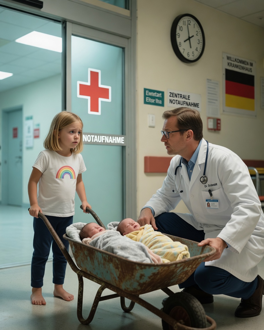 Als die automatischen Türen an jenem Morgen aufglitten, erstarrte die Krankenschwester an der Anmeldung. Ein Mädchen – nicht älter als sieben Jahre – schob einen rostigen Schubkarren durch den Eingang. Darin lagen, in eine dünne Decke gewickelt, zwei Neugeborene. Ihre Gesichter waren blass, aber sie atmeten. Dem kleinen Mädchen klebten die Haare an der Stirn, ihre Kleidung war zerrissen und ihre Stimme zitterte, als sie sprach.