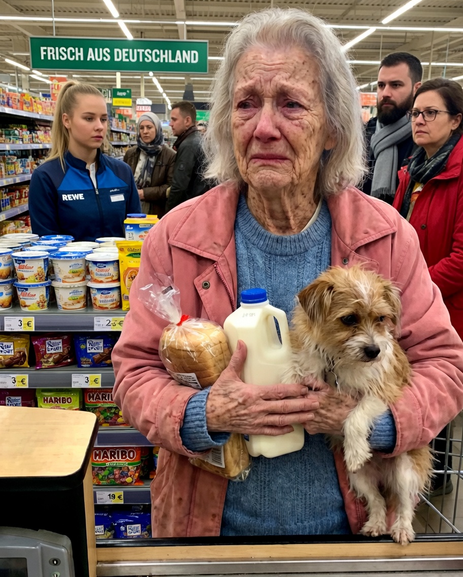 Dann bemerkte ich die Frau ganz vorne an der Kasse. Sie war klein. Alt. Eingehüllt in einen Mantel, der so abgenutzt war, dass die Ärmel nur noch aus Fäden bestanden. Ihr Rücken war gebeugt, als hätte das Leben jahrelang auf sie herabgedrückt. Sie legte zwei Dinge auf das Band: Brot und Milch.