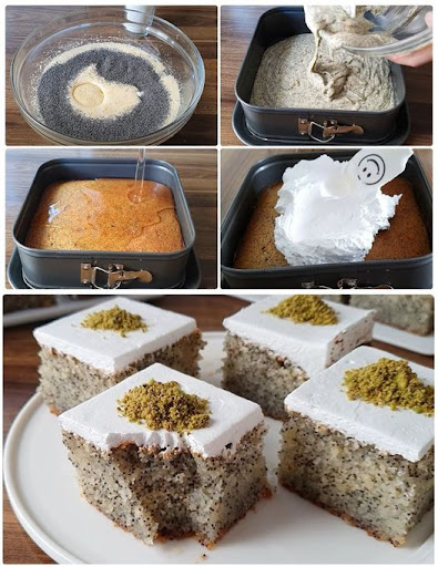 Teig: Eine Backform von 30x25cm einfetten und beiseite stellen. Den Ofen vorheizen auf 180 Grad Celsius. Die Eier in eine Schüssel aufschlagen und eine Prise Salz und Zucker hinzufügen. Mit einem Mixer schlagen, bis eine helle cremige Masse entsteht. Milch, Öl und Vanilleextrakt hinzufügen und weiter rühren. Die Mischung aus Mehl, Grieß, Mohn und Backpulver hinzufügen. Alle Zutaten im Mixer vermischen. Den Teig in die Backform gießen, glatt streichen und in den Ofen stellen. Den gebackenen Teig (mit einem Zahnstocher die Garheit überprüfen) abkühlen lassen, während der Sirup gekocht wird.