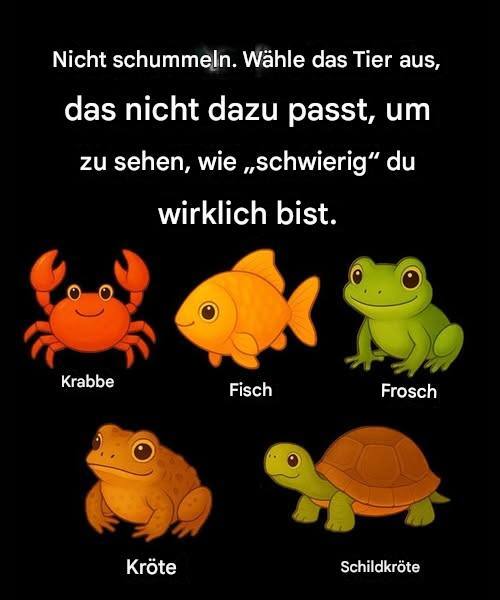 Du gehörst zu den Menschen, denen strukturelle Unterschiede sofort auffallen. Die Krabbe sticht hervor, weil sie Scheren, zusätzliche Beine und eine völlig andere Körperform als die anderen hat. Im Gegensatz zu Fröschen, Schildkröten, Kröten und Fischen, die alle einen länglichen, zweigeteilten Körper besitzen, sieht die Krabbe fast kreisförmig aus.