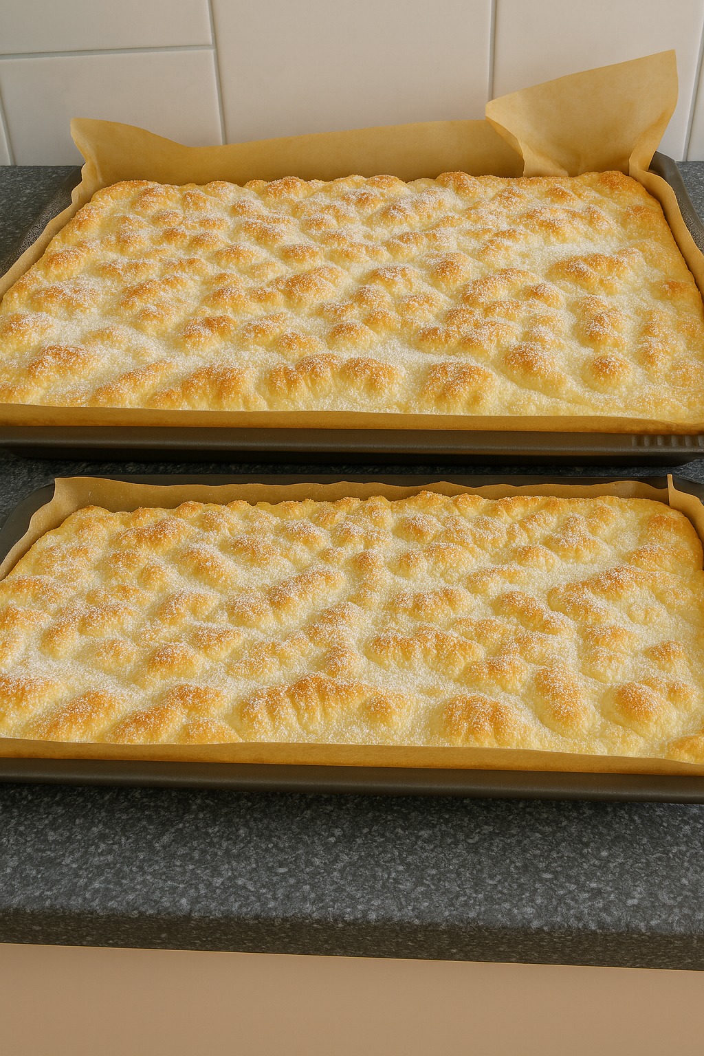 Danach den Teig auf ein gefettetes Blech geben und bei 175° im vorgeheizten Backofen ca. 20 Minuten backen