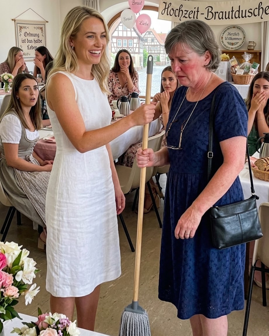 Es zersplitterte auf dem Boden. Dann hielt sie mir mit einem Lächeln etwas entgegen. Im Raum wurde es totenstill. Sophie sah mich direkt an. Nicht die Gastgeberin. Nicht das Personal des Saals. Mich. Sie bückte sich, griff nach einem Mopp, der neben der Catering-Station bereitstand, und brachte ihn herüber, als wäre das alles von langer Hand geplant gewesen.